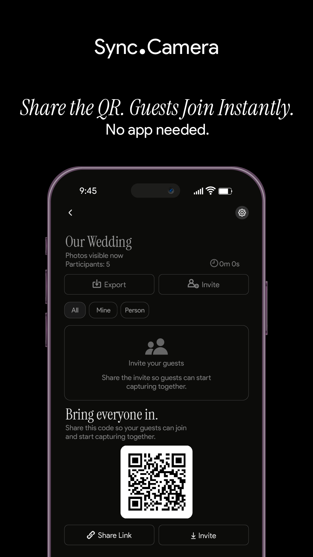 Capture an event together with everyone there. Share a code, point your camera, and watch the album fill in real time.